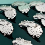 2" hard enamel pin. Shiny silver metal with black enamel. Includes rubber clutch, two posts, and logo back stamp.